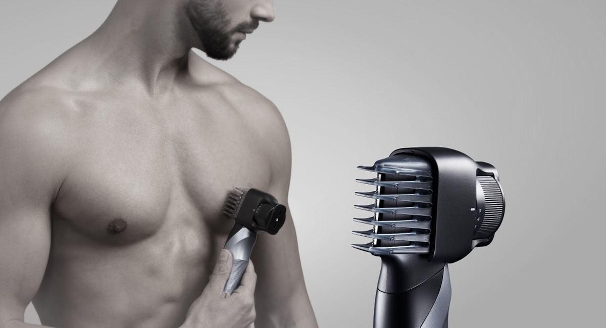 An attachment for groin and armpits grooming is included. The tips of the attachment are rounded to be gentle to skin. And there's a space of approx. 2 mm between the attachment and the skin to enable safe cutting without harming soft skin in sensitive areas.