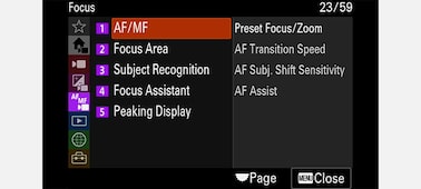 | Other features | AF Level for Crossing (Still), AF Track for Speed Change (Still), AF Subj. Shift Sensitivity (Movie), AF Transition Speed (Movie), Switch V/H AF Area, AF Area Regist., Circ. of Focus Point, Focus Map (Movie), AF Assist (Movie) |