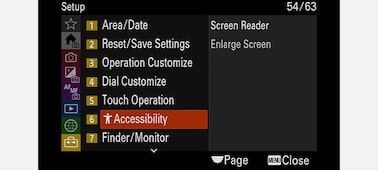 | FUNCTIONS | Screen Reader, Focus Magnifier, Focus Map (Movie), Peaking Display, Subject Recognition in AF, Touch Focus, Touch Tracking, Touch Shutter, Touch AE, Multi-angle LCD screen, Custom function, Enlarge Menu Screen |