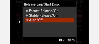 Selectable release time lag modes are available via the [Release Lag] / [Start Display] menu. With blackout occurring on only the first image in a continuous burst, [Fastest Release/On] provides the shortest possible release time lag, while [Stable Release/On] minimizes variations in release time lag making it easier to release the shutter at the intended moment. The default [Auto/Off] setting gives no blackout when shooting is started.