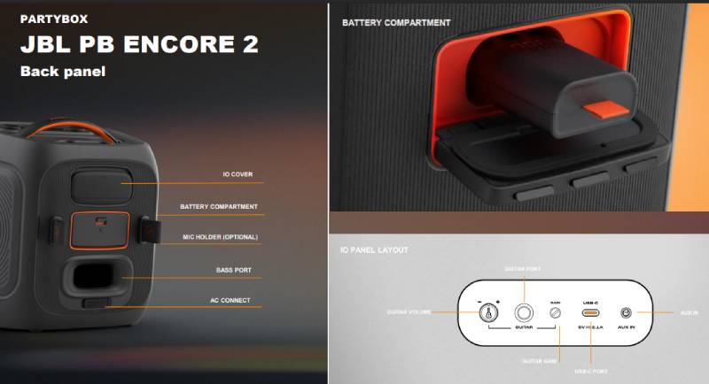 AUX-IN, USB-C, Guitar input, Pre-gain & volume knob for guitar